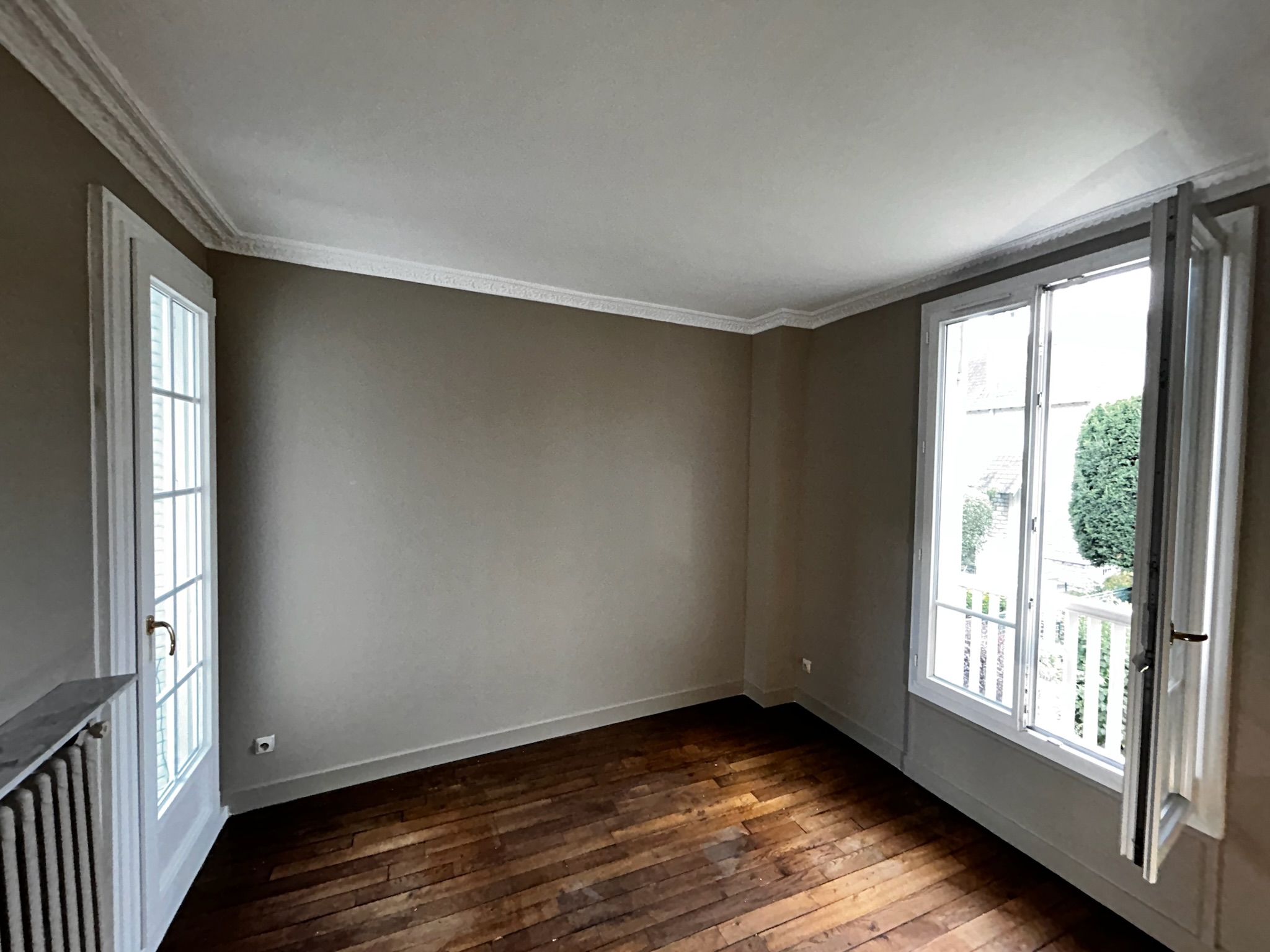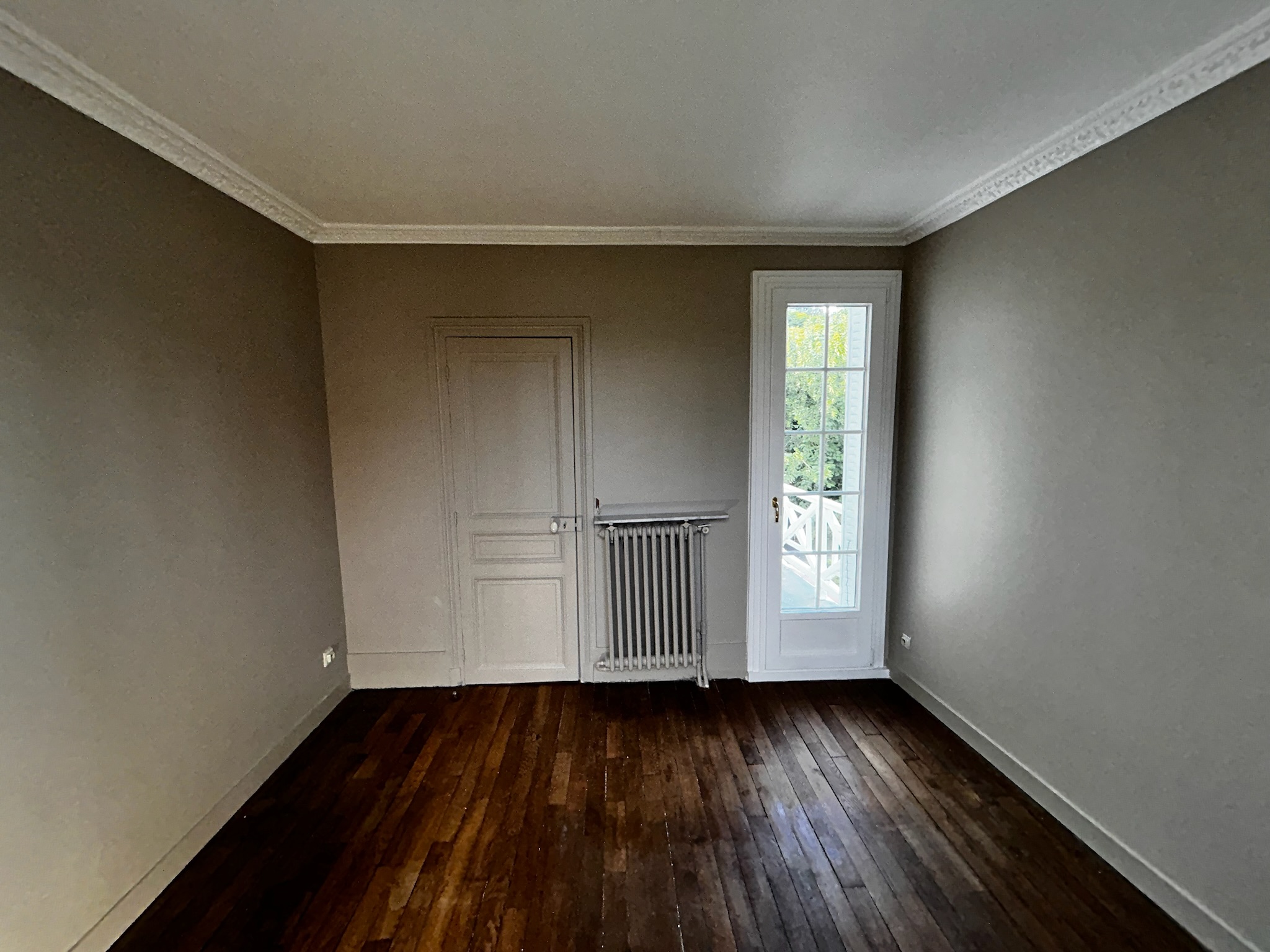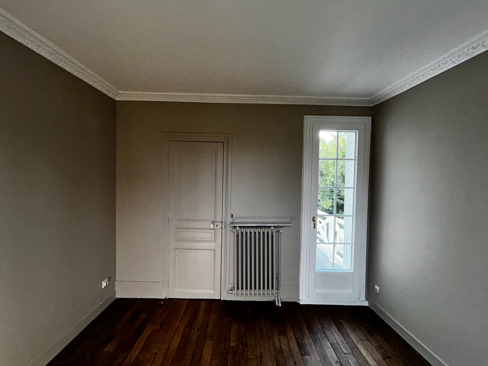 Séjour rénové d’une maison de style château à Enghien-les-Bains – murs restaurés, boiseries préservées et moulures d’origine mises en valeur
